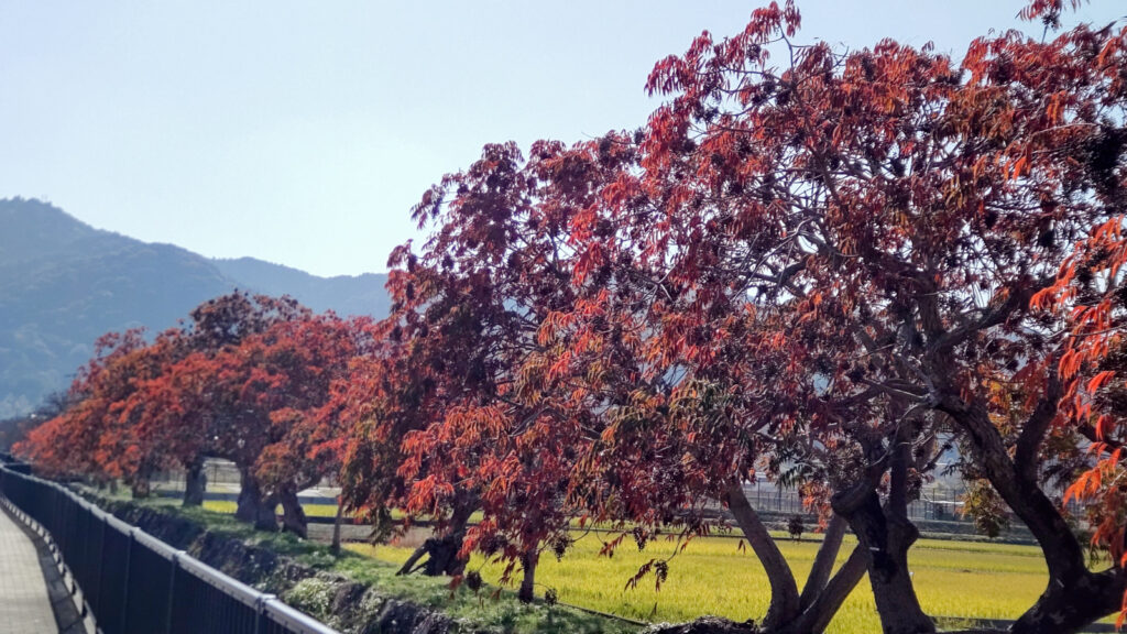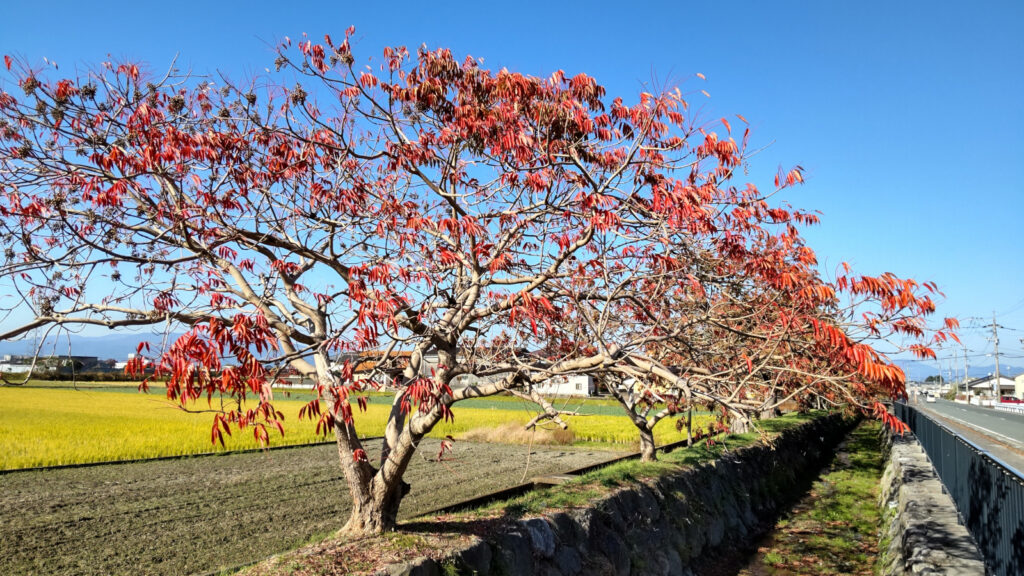 それでも部分的に 櫨の葉が残っている木もありましたので、写真は撮りました。でも、やはり櫨は並木全体が色付いていないと迫力不足ですし、たいへん物足りなさを感じます。